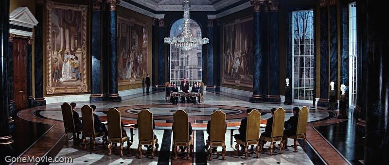 Oltre ai vari veicoli Ken Adam realizza come sempre imponenti scenografie, come quelle, specularmente opposte, della sala riunioni della SPECTRE e di quella del Ministero. La prima è tutta decorata sui toni del grigio metallizzato, per dare l’idea di quanto freddo e spietato sia il nemico. Adam come sempre aggiunge elementi di arredamento semoventi, in questo caso le poltrone elettrificate che scompaiono nel pavimento oltre a schermi e mappe. Come di consueto, del Numero Uno Ernst Stavro Blofeld non vediamo il volto, sentiamo però la voce che è ancora una volta dell’attore Eric Pohlman, mentre le mani che accarezzano l’immancabile gatto bianco sono quelle di Anthony Dawson. La sala in cui si riuniscono gli agenti segreti invece è lussuosa e luminosa, arredata in modo classico e sfarzoso per sottolineare la potenza rassicurante dei buoni. Sia Bond che Largo si presentano per ultimi alla riunione: loro sono i membri più importanti delle rispettive organizzazioni, il meeting non può iniziare prima del loro arrivo.