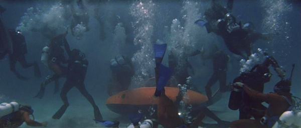 Gli spettatori sono ormai abituati sia ai set straordinari di Ken Adam che alle location glamour ed esotiche dei film di 007: sono quindi pronti per essere stupiti dalle molte sequenze subacquee di Thunderball (che sono in totale circa il 25% delle riprese). Per il film sono pronte ben quattro unità di ripresa, di cui una interamente dedicata alle riprese sott’acqua, composta di una ventina di persone (tra cui i pionieri delle riprese sottomarine Jordan Klein e Lamar Boren, che si costruiscono da soli la cineprese per riprese subacquee) e capitanata da Ricou Browning, sub e tecnico esperto (c’era lui sotto il costume del celebre Mostro della Laguna Nera nelle scene acquatiche).
