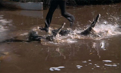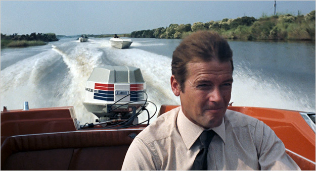 Prima di lasciare New Orleans non resta che girare, finalmente, l’inseguimento in barca. Durante le prove, il motoscafo di Roger Moore rimane all’improvviso senza benzina e si arresta bruscamente, catapultando in avanti l’attore che batte violentemente il viso e una gamba: fortunatamente Roger può girare la scena anche se zoppica vistosamente e le riprese continuano. Hamilton e Mankiewicz hanno immaginato che l’imbarcazione di Bond faccia un lunghissimo salto, ma nessuno stuntman riesce ad eseguirlo. Il problema viene dunque sottoposto agli allievi della facoltà di ingegneria locale, i quali riescono a calcolare esattamente la giusta velocità e inclinazione della rampa: grazie a loro, lo stuntman Jerry Comeaux (che ha insegnato a Moore a pilotare il motoscafo) riesce a saltare oltre 35 metri, stabilendo un nuovo record e portando a casa la scena al primo ciak. Nonostante alcune altre barche rovesciate, la scena avrà grande successo e diventerà una delle più famose della saga, anche grazie al divertentissimo personaggio dello Sceriffo Pepper (interpretato dal newyorkese Clifton James che indossa un’imbottitura per la pancia e imita impeccabilmente l’accento del sud) affiancato da molti veri poliziotti (coinvolti dal regista per assicurarsi la collaborazione delle forze dell’ordine locali). Quando sembra ormai tutto concluso, Roger Moore viene richiamato frettolosamente per nuove riprese in barca: alla sua controfigura mancava un pollice! A chiudere l’inseguimento viene inquadrato ironicamente il cartello “Make Boating Safe and Fun” e divertentissimo è il contrasto tra lo sceriffo Pepper, paonazzo e agitatissimo, e un flemmatico Bond che si aggiusta la cravatta. Portato finalmente a termine l’inseguimento in barca, è tempo di partire, con più di due tonnellate di attrezzatura (ma finalmente liberi dalle zanzare), per la Giamaica.