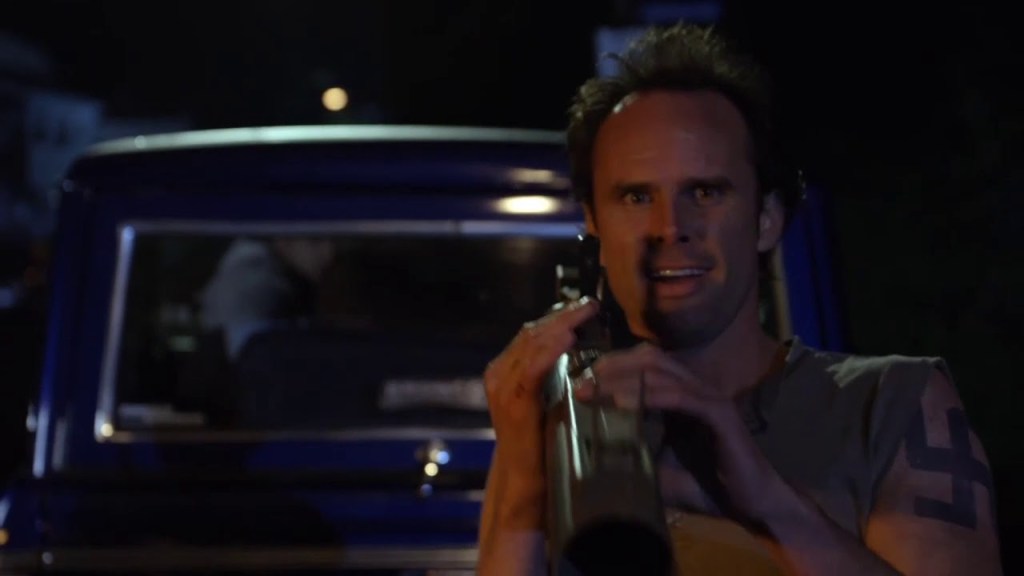 Questa è la premessa di una serie che ho adorato dall’inizio alla fine per così tanti motivi che l’elenco sarà lungo, a differenza della durata percepita della serie: sei stagioni che sono sembrate una sola. All’inizio veniva raccontato un caso diverso in ogni puntata, e ciascuno di essi era pensato e scritto benissimo, ma presto gli autori hanno scelto di concentrarsi piuttosto su una storia principale, inserendo un nuovo “cattivo” in ogni serie come avversario di Raylan, e a mio parere la scelta è stata molto soddisfacente. Raylan Givens è un personaggio solo all’apparenza repulsivo per lo spettatore: troppo bello, troppo bravo, troppo pieno di sé; ma in realtà ci si affeziona subito sia alla sua integrità, così fuori posto in un contesto simile, alla sua grande sagacia e al suo umorismo. Ma naturalmente un personaggio così non potrebbe funzionare senza una serie di spalle adeguate, e qui entrano in gioco gli attori secondari, tutti bravissimi. E soprattutto dobbiamo parlare dei cattivi, che sono tutti diversi e tutti efficaci, ma su tutti troneggia la nemesi del protagonista, amico di gioventù e suo pari per fascino e astuzia: Boyd Crowder, interpretato magistralmente da Walton Goggins, la vera arma segreta della serie. L’eterno scontro tra Raylan e Boyd è coinvolgente e intrigante dall’inizio alla fine e dà vita ai dialoghi più sfiziosi.